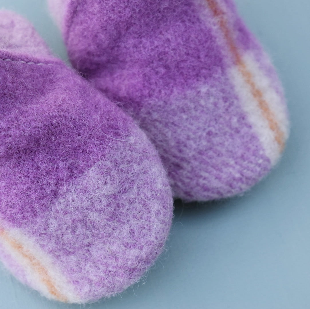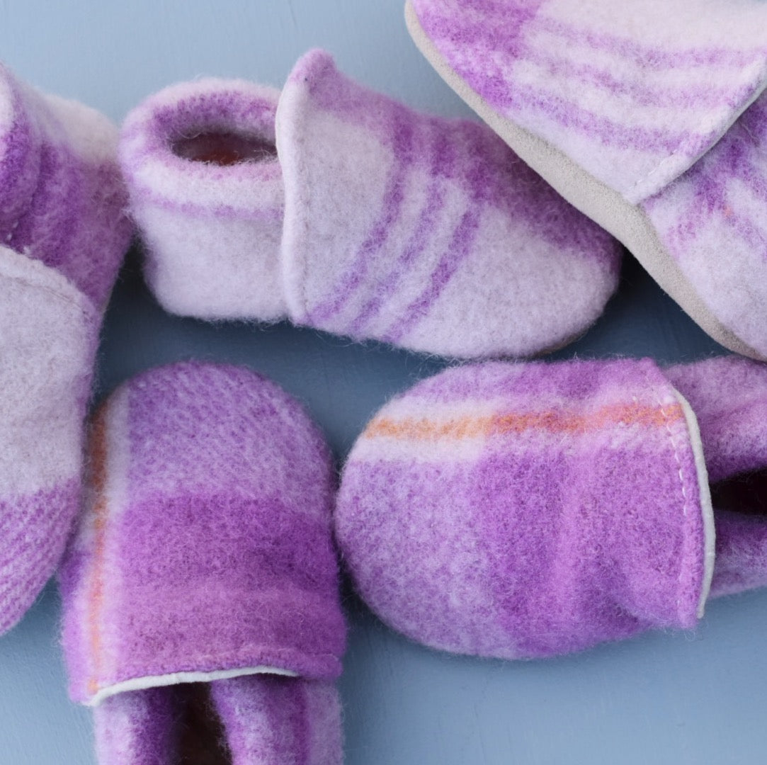 This pair of loafers is made from plaid felted wool. Features beige suede bottoms (double layer) and an elastic around the ankles for easy on and off.