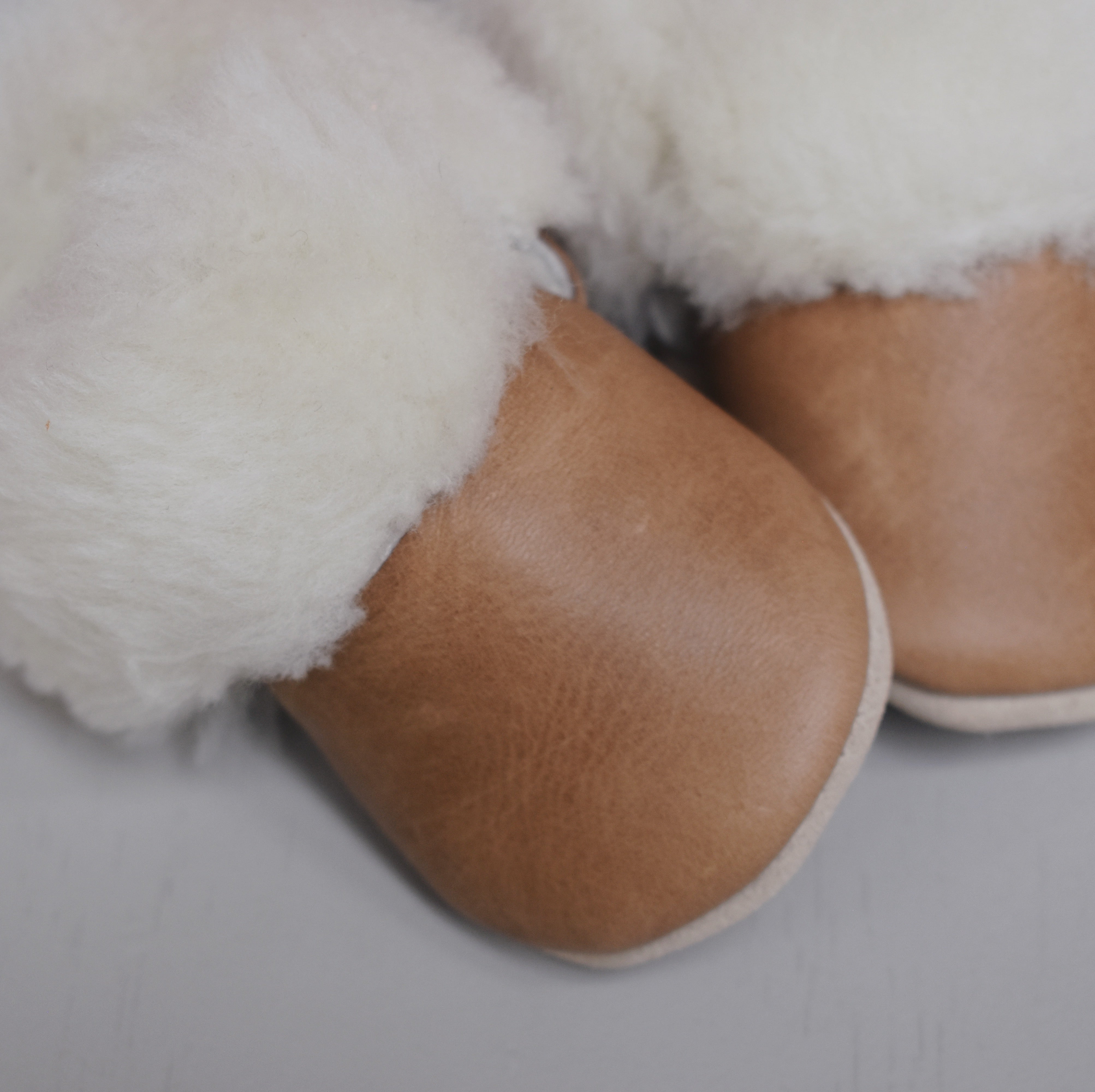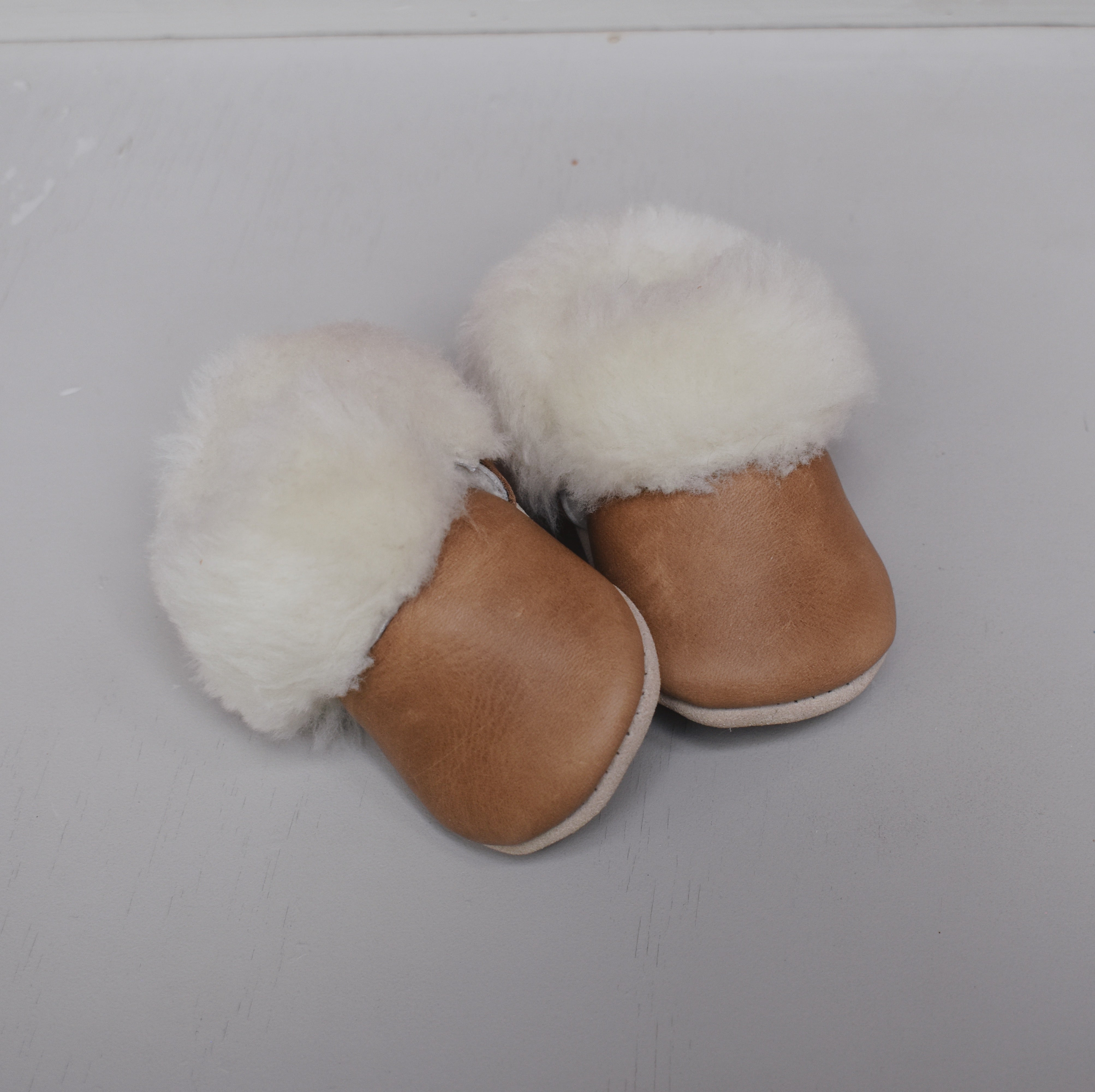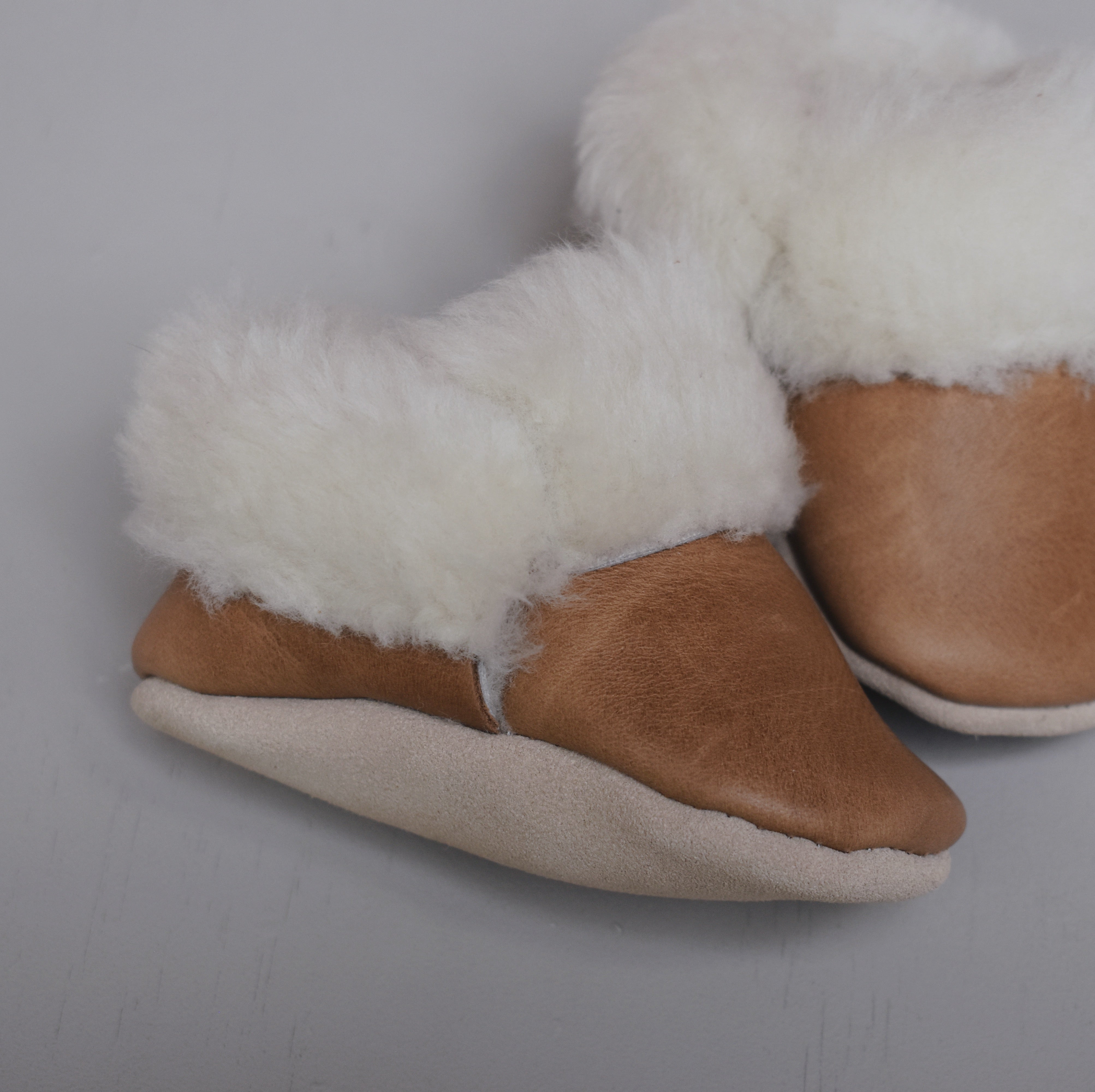 This pair fully lined in shearling/sheepskin (100% real) and a heavy wool lining on the sole. The lining will keep those toes toasty all winter long. Features a beige suede sole and elastics around the ankles. Every pair is made by hand in Canada.