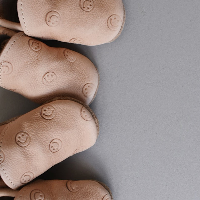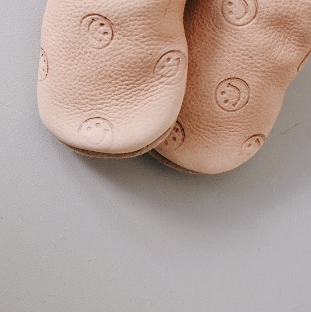 This pair of loafers is made from beautiful natural leather with hand stamped smiley faces, with beige suede bottoms (double layer). They feature elastic around the ankles for easy on and off.